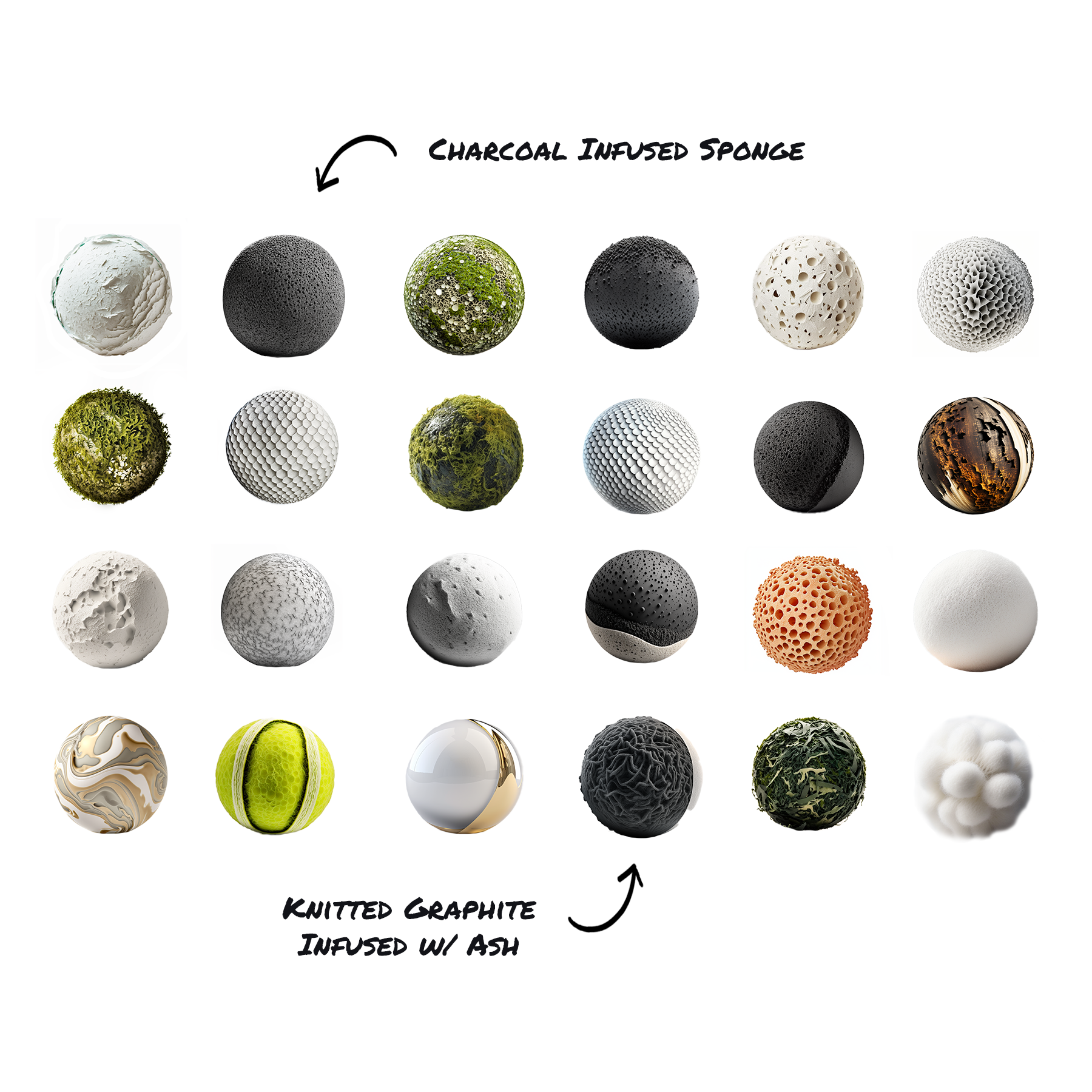 Each of these spheres was created using MidJourney, reimagining new materials, textures, properties, and unlikely material combinations. The goal was to craft a compelling story that retains the aesthetics of materials that are not yet in existence.